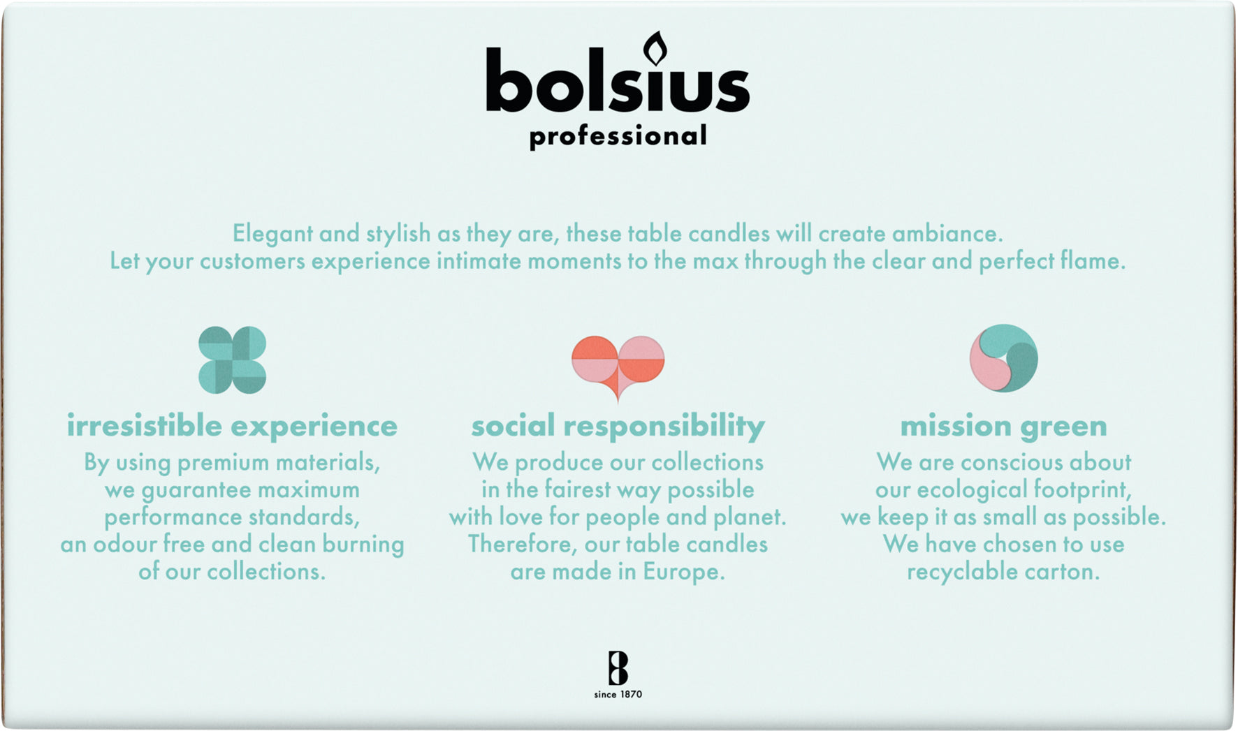 Bolsius professional kaarsen bieden een prachtige vlam en betrouwbare brandtijd door meer dan 140 jaar ervaring op gebied van kaarsen.
