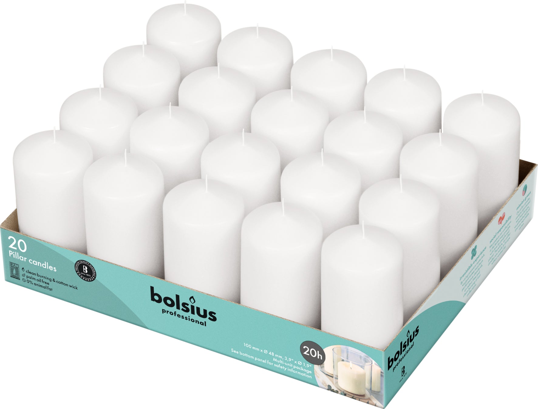 Met deze wit kleurige stompkaarsen van Bolsius creëert u direct een warme, uitnodigende sfeer. De 10cm hoge kaarsen hebben een brandtijd van wel 20 uur, waardoor u ze niet vaak hoeft te vervangen. Dat scheelt u tijd én geld. de lont is eenvoudig meerdere keren aan te steken en de was is speciaal samengesteld om weinig rook te produceren, om overlast voor uw gasten te voorkomen. Dankzij de verpakking met 20 kaarsen legt u eenvoudig een ruime voorraad aan, zodat u snel een uitnodigende sfeer kunt creëren.