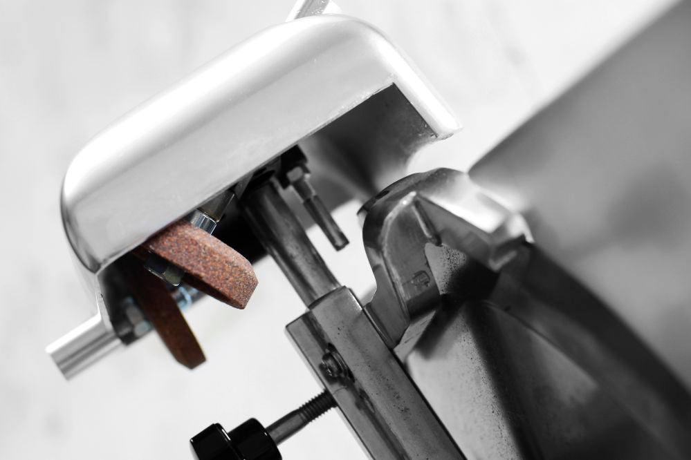 Voldoet aan alle veiligheidseisen voor commercieel gebruik door o.a.: - Met het mes in de 0-stand blijft het snijvlak achter de mesbeschermer - Beveiligd tegen inschakelen als de slijpinrichting niet gemonteerd is, beveiliging ook actief als de beschermplaat van het mes verwijderd wordt - Slede kan enkel vergrendeld en verwijderd worden als het mes in de 0-stand staat Niet geschikt voor het snijden van kaas, alleen mogelijk met apart verkrijgbaar mes met antikleefcoating.