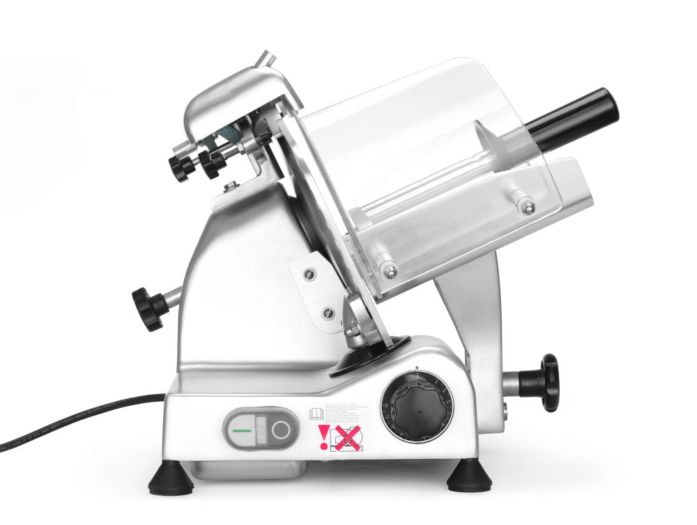 Voldoet aan alle veiligheidseisen voor commercieel gebruik door o.a.: - Met het mes in de 0-stand blijft het snijvlak achter de mesbeschermer - Beveiligd tegen inschakelen als de slijpinrichting niet gemonteerd is, beveiliging ook actief als de beschermplaat van het mes verwijderd wordt - Slede kan enkel vergrendeld en verwijderd worden als het mes in de 0-stand staat Niet geschikt voor het snijden van kaas, alleen mogelijk met apart verkrijgbaar mes met antikleefcoating.