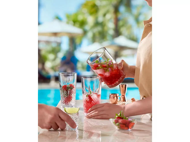 Met een hoogte van 147 mm en een diameter van 79 mm ligt het glas prettig in de hand en biedt het voldoende ruimte voor ijs, garnering en jouw favoriete mixdrankje. Deze set van 4 glazen komt verpakt in een stijlvolle doos en is een echte aanwinst voor elke bar of tafelsetting.